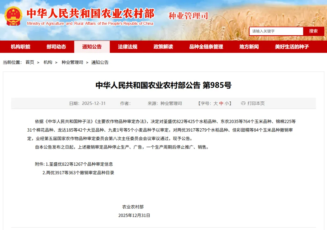 近日,農(nóng)業(yè)農(nóng)村部發(fā)布公告,共審定通過(guò)水稻品種425個(gè)、玉米品種764個(gè)、棉花品種31個(gè)、大豆品種42個(gè)、小麥品種5個(gè)。東亞種業(yè)3個(gè)玉米品種通過(guò)國(guó)家審定。