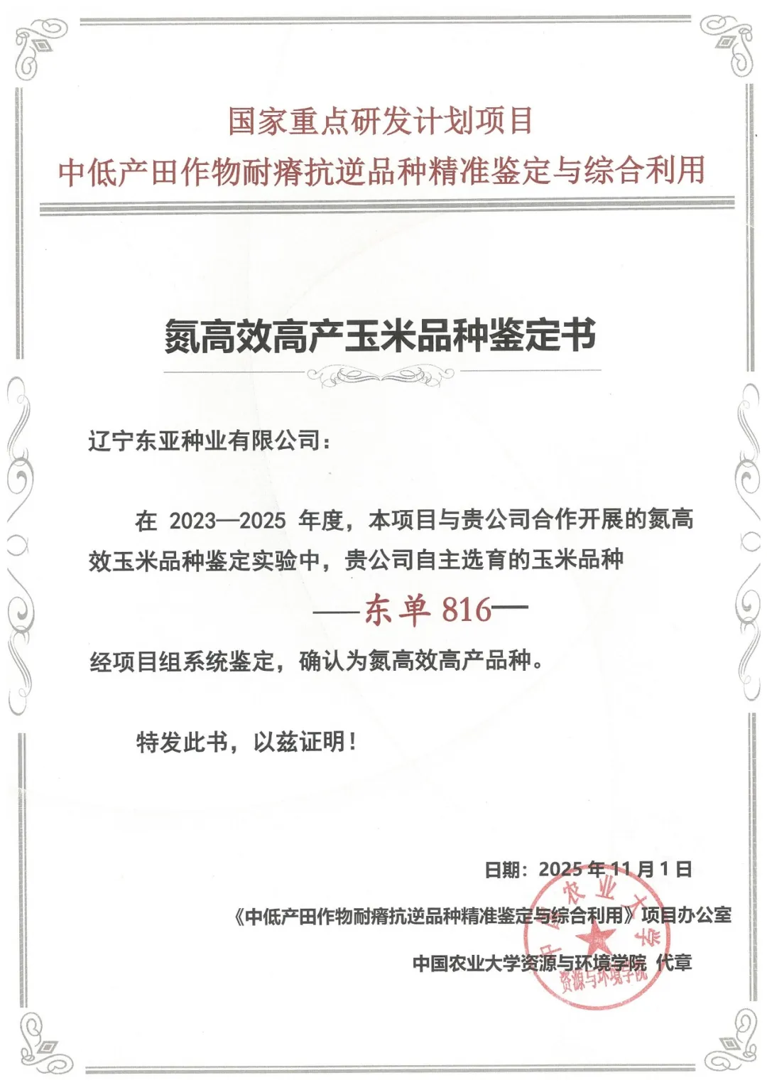 東單816 | 獲中國農業(yè)大學氮高效高產品種權威鑒定