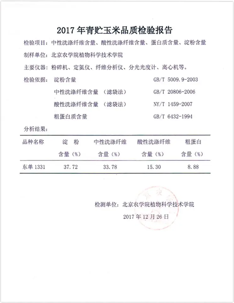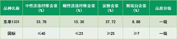 東單1331用于青貯產(chǎn)業(yè),糧飼通用品質(zhì)好,淀粉含量高達(dá)37.72,纖維、粗蛋白等含量合理。全株青貯,有65%的營養(yǎng)來自于籽粒,10%來自于細(xì)胞內(nèi)含物,25%來自于消化纖維。青貯果穗一樣大,既能收草,也能收籽粒,是糧飼通用的大品種。